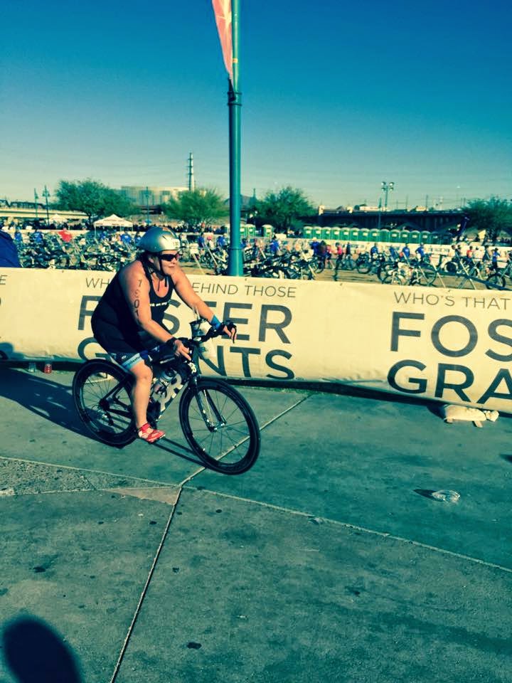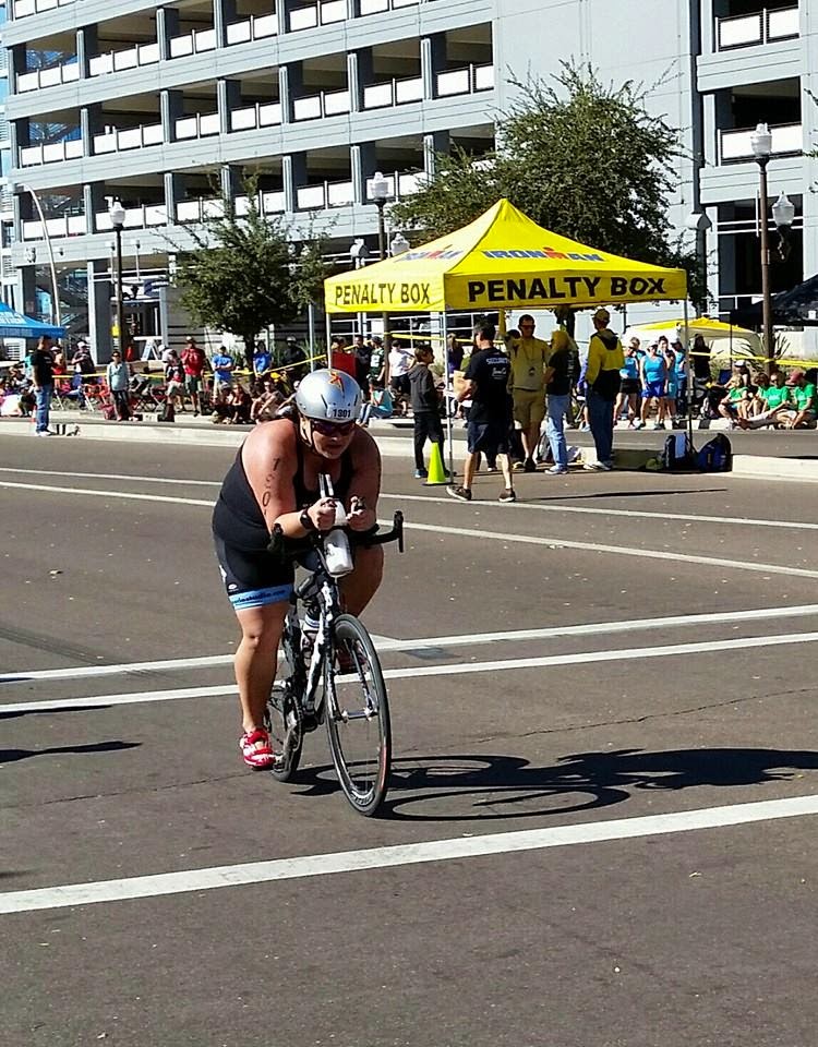 In T1 I was greeted by Elysha and she helped me get ready for the bike. It was much different going into the change tent when it was packed. I PR’d my swim by 12 minutes, so it was a different scene than last year!