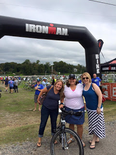 Woke up and it was race day! Stephanie and Andrea got to experience the pre-race ritual which includes getting up very early! I had to get creative with putting on my race tats on the left arm since it was taped up. I got to transition in plenty of time, set my stuff up, caught the shuttle to swim start and the nerves started to kick in. I knew the swim was going to be fast with the current, but I wasn’t sure how fast. I knew I could handle the bike after training in Brown County this year and the run was flat and there was a big crowd, so I knew I’d keep running. I ran into Jen who was up from Jacksonville and found Stephanie and Andrea. Next thing I knew I was in line with my age group and ran into my friend Laura from Arizona.