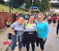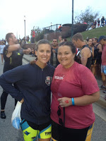 Woke up and it was race day! Stephanie and Andrea got to experience the pre-race ritual which includes getting up very early! I had to get creative with putting on my race tats on the left arm since it was taped up. I got to transition in plenty of time, set my stuff up, caught the shuttle to swim start and the nerves started to kick in. I knew the swim was going to be fast with the current, but I wasn’t sure how fast. I knew I could handle the bike after training in Brown County this year and the run was flat and there was a big crowd, so I knew I’d keep running. I ran into Jen who was up from Jacksonville and found Stephanie and Andrea. Next thing I knew I was in line with my age group and ran into my friend Laura from Arizona.